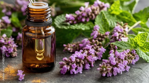essential oil, lavandula, mint, bottle, dropper, purple, flower, green, leaf, aromatherapy, wellness, health, natural, organic, herbal, plant, closeup, macro, photo, image, product, spa, medicine, treatment, therapy, beauty, cosmetic, isolated, background, texture, dark, amber, copy space, overhead, still life