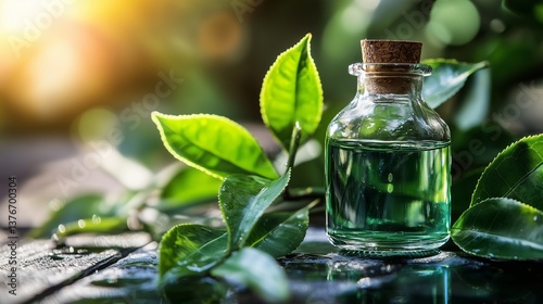 Essential oil in a glass bottle surrounded by fresh green leaves during golden hour