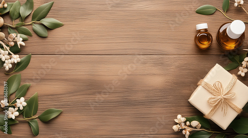 Essential oils and aromatherapy items displayed on a wooden surface surrounded by natural elements and a gift box