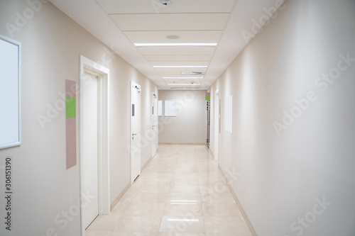 Esthetic and clean modern private clinic or vet hallway corridor with empty posters