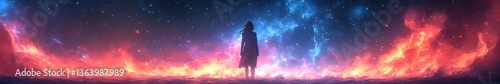 silhouette, figure, solitude, introspection, cosmos, aethereal, landscape, light, dark, space, person, scene, mystery, abstract, dreamlike, dramatic, surreal, mysterious, night, lonely, alone, epic, fantasy, scenic, view, heaven, star, sky, blue, red, spiritual, journey, inner, deep, emotional, soul, explore, discover, wonder, thought, reflect, mulling, meditate, mind, peace, calm, beauty