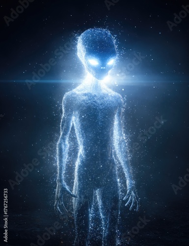 alien, aethereal, glowing, shimmering, light, blue, dark, android, figure, form, radiant, mystic, cosmic, space, mysterious, spectral, phantom, apparition, plasma, energy, particle, divine, celestial, star, existence, surreal, fantasy, dreamlike, science, fiction, extraterrestrial, unknown, unearthly, other, dimension, being, presence, aglow, silhouette, nebula, atmosphere, stellar, evacuated, illustration, digital, art, vertical