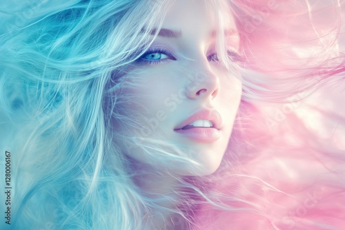 woman, portrait, face, blond, hair, blue eye, fair skin, beauty, make-up, cosmetic, female, model, head shot, closeup, art, artistic, style, fashion, glamour, pretty, attractive, young, person, girl, lady, skin, lip, eye, eyelash, eyebrow, nose, cheek, chin, forehead, neck, shoulder, coiffure, wavy, flowing, colourful, pink, blue, pastel, soft, aethereal