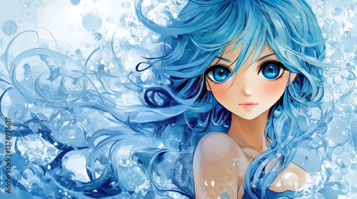 anime, girl, blue, hair, water, ocean, wave, fantasy, whimsical, artistic, digital, art, illustration, portrait, beautiful, eye, face, long, flowing, bubble, water, teal, turquoise, light, bright, pastel, soft, dreamy, serene, peaceful, calm, elegant, graceful, pretty, cute, style, artwork, drawing, painting
