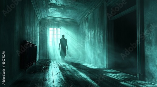 haunted, hallway, figure, shadow, mystery, dark, teal, light, sunbeam, dust, gloom, atmosphere, haunting, eerie, room, house, building, old, antique, vintage, decay, creepy, gothic, dramatic, silhouette, man, walking, door, window, wood, floor, wall, texture, art, design, image, photo, visual, horror, suspense, thriller, artwork