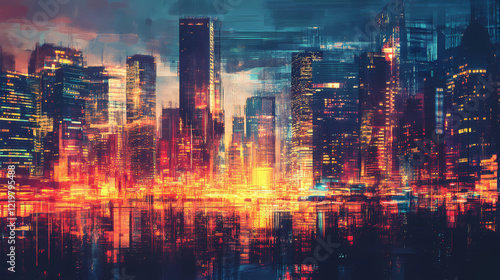 Ethereal urban skyline at dusk bold silhouettes and glowing cityscape in motion. Amber Horizon. Illustration