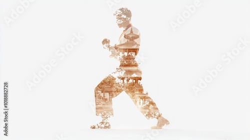 Ethereal Warrior: Double Exposure Portraits Illustration of Martial Artist in Motion Against Ancient Temple Backdrop
