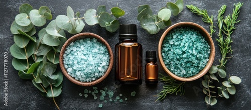 sea, salt, eucalyptus, spa, essential, oil, aromatherapy, natural, relaxation, wellness, organic, healing, herbal, therapy, beauty, health, green, leaf, brown, bottle, glasses, wood, bowl, black, grey, dark, background, texture, top, view, still, life, photo, fresh, ingredient, treatment, luxury, mineral, crystal, aromatic, fragrance, herbalism, holistic