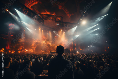 Euphoric Concert Spectacle. Vibrant Atmosphere with Lights, Smoke, and Electrifying Artist