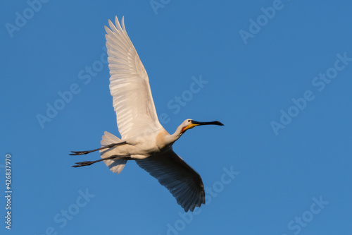 Eurasian spoonbill (Platalea leucorodia) in flight. Photographed in the Netherlands.