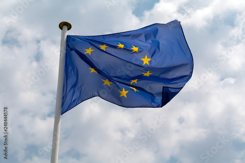 europa, flag, yellow, blue, patriotic, waving, fabric, rippled, colours, creased, crumpled, texture, cloudy, sky, flag pole, flying, euro, star, union, alliance