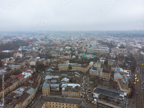 town, city, city life, center, european, lviv, ukraine, urban, overcast, smoke, fog, hill, peak, building, street, skyline, drone, flight, birds eye view, tower, church, traffic, rain, rainy weather, weather, spring, aerial, aerial view, light, mist, copy space