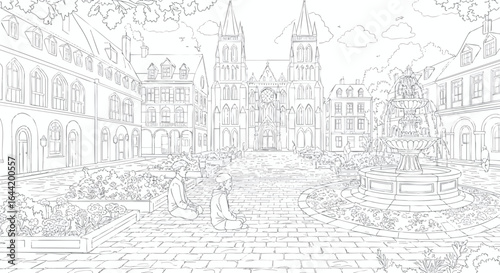 European City Square Coloring Page Medieval Architecture and Fountain