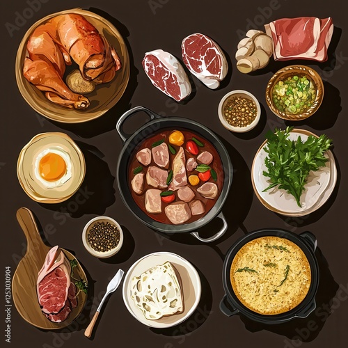 food, cookery, traditional, rustic, meal, topview, illustration, culinary, epicure, fresh, ingredient, dining, table, arrangement, savoury, colours, culture, heritage, hand-made, vegetable, herb, wood, serving, presentation, art, natural, favor, diverse, seasonal, plating, plate, dish, homemade, aesthetic, design, vibrant, texture, organic, authenticity, appetiser, brunch, gathering, simplicity, taste, harmony, visual