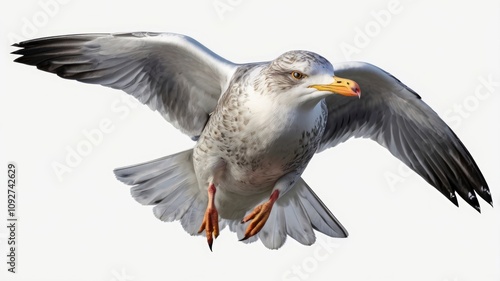 European Herring Gull, Larus argentatus, 4 years old, flying against white background