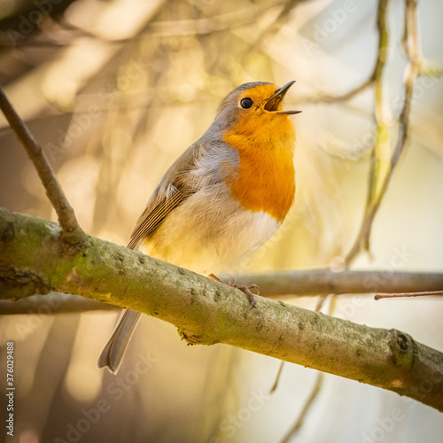 European robin (Erithacus rubecula) male on a branch singing