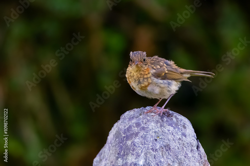 European robin "Erithacus rubecula" standing on stone. Young juvenile redbreast bird isolated against dark green background. Wicklow, Ireland
