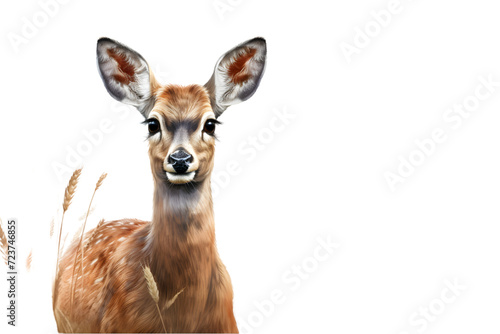 European roe deer in a field. Roe deer with weed around it's antlers. Roe deer wildlife isolated on white background. Generative AI.