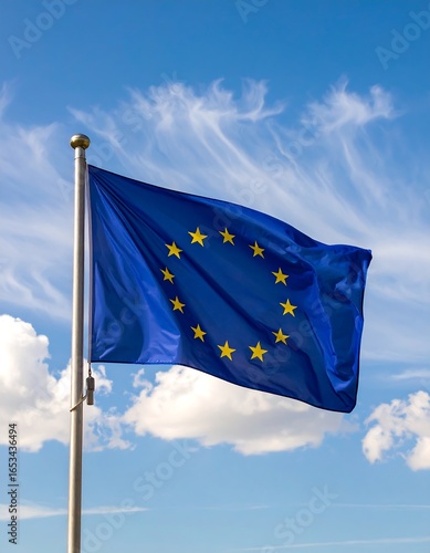 flag, union, europa, blue, star, yellow, sky, cloud, waving, banner, pole, symbol, european, community, international, government, political, nation, proud, bright, day, outdoors, breeze, patriotism
