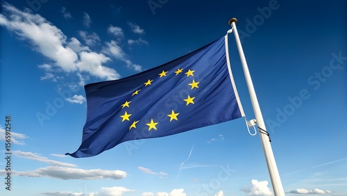 European Union Flag Waving in the Wind Against Clear Blue Sky