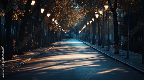 Evening glow: An illuminated avenue casting long shadows in the fading light