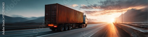 truck, highway, motion, sunset, journey, transport, freight, logistic, vehicle, speed, shipping, road, transportation, travel, cargo, driving, container, traffic, evening, landscape, delivery, industry, route, dusk, horizon, asphalt, scenery, sunrise, commerce, trucking, expressway, automotive, lifestyle, movement, countryside, expedition, fast, supply, scenic, freedom