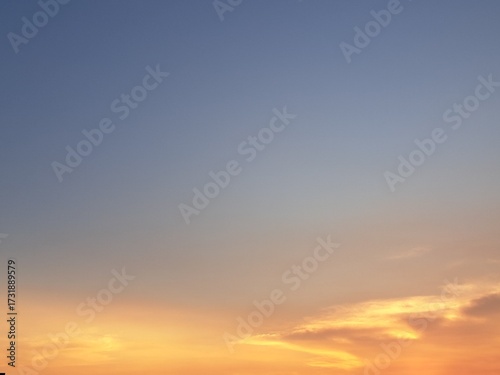 Evening sunset with an orange blue sky – White and grey clouds illuminated by the last remaining rays of the bright orange evening sun, amidst a darkening blue sky.