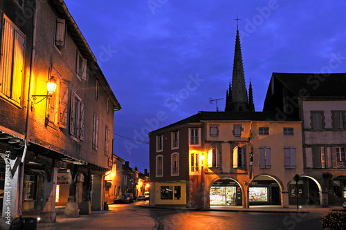 Evening view of a street in Marciac, Gers department, with lights shining and buildings standing under a darkening sky in southwest France