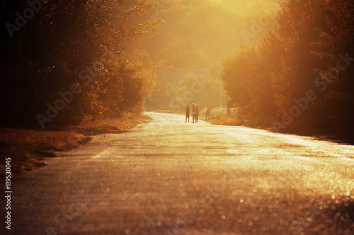 Evening walk. Group of girls walking along road in beautiful evening light. Rural landscape with road. Childhood in village. Backlight
