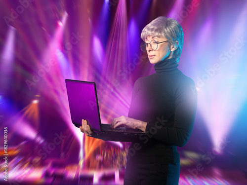 Event management specialist coordinates stage lighting effects using a laptop, adjusting visual settings in a vibrant concert environment.