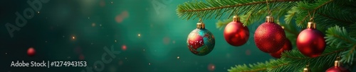 Evergreen branch with colorful ornaments hanging from branches, decorations, evergreen, ornaments