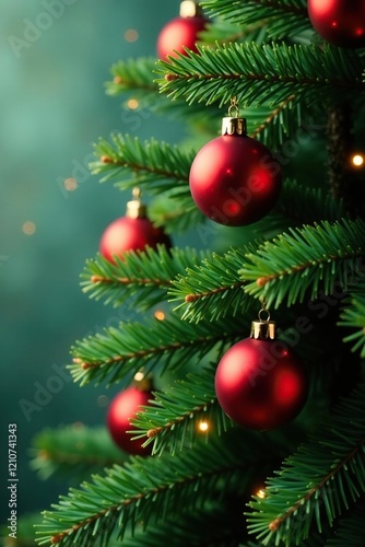 Evergreen tree with bright red glass ornaments hanging from branches, evergreen, red ornaments