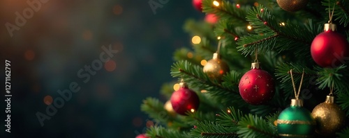 Evergreen tree with colorful ornaments scattered around branches, wooden ornaments, holiday ornaments, Christmas tree lights