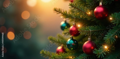 Evergreen tree with multicolored ornaments and soft fairy lights against a warm background, colorful baubles, holiday decor