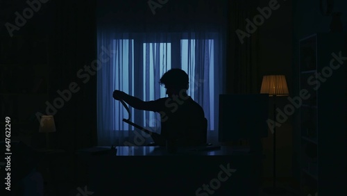 desk, computer, adult, home, male, man, working, document, keyboard, freelance, distant, office, hot drink, paper, room, living, apartment, silhouette, dark, furniture, house, window, curtain, light, closeup, background, interior, closet, lamp, table, blue, concept, lifestyle, person, portrait, casual attire, indoor, clothing, everyday, life, routine, daily, leisure, young, work, chair, personal, black, scene