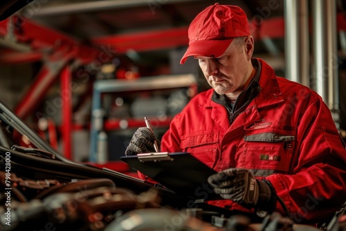 mechanic, adult, apparel, architecture, auto, building, cap, car, clipboard, clothing, commercial, engine