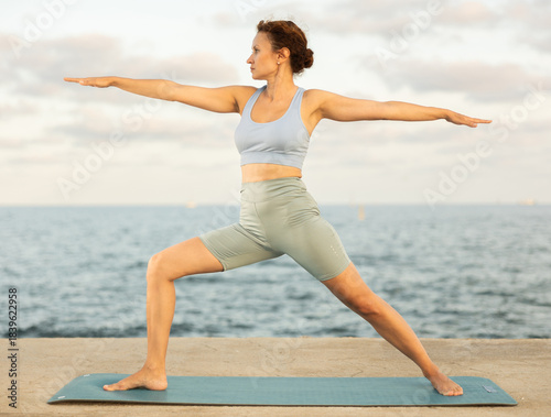 Example of performing hatha yoga asana. Amateur and professional girl doing yoga near sea, on embankment she fulfil warrior pose, Virabhadrasana
