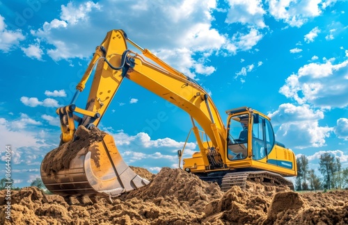 shoveling, shoveling, construction, machine, heavy, equipment, yellow, sand, dirt, ground, sky, blue, cloud, white, bright, sunny, day, work, site, building, project, industry, engineering, machinery, metal, track, crawler, arm, bucket, operator, cabin, window, landscape, nature, background, photo, image, photo