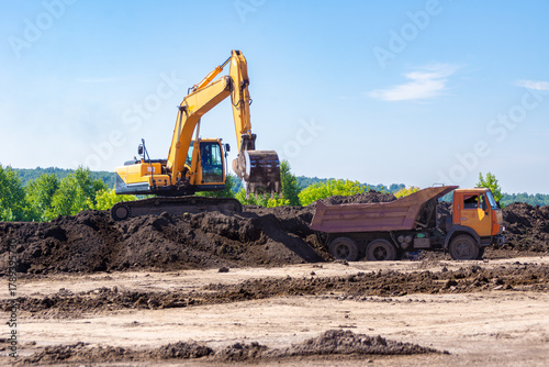Excavator loading black earth onto dump truck for topsoil conservation before construction under clear blue sky