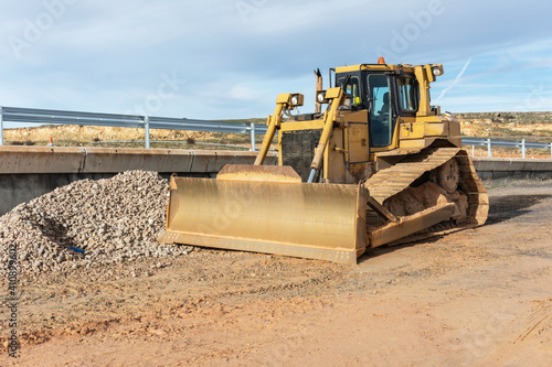 Excavator making earth movements for the construction of a road