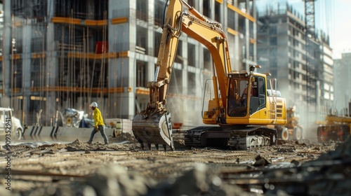 Excavator Operates on Construction Site While Workers Manage Ongoing Development in Urban Area