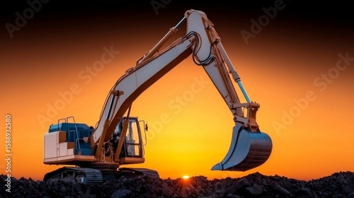 Excavator operating at a construction site under a breathtaking sunset sky with vibrant colors in the background