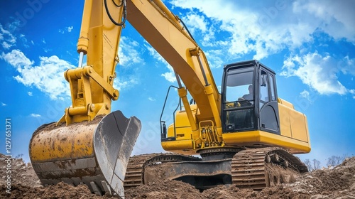 Excavator operating in construction site urban environment heavy machinery clear sky dynamic action