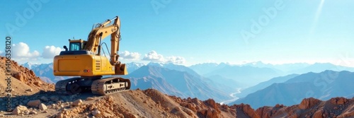 Excavator standing on a vast blue sky with mountains in the background, industrial, excavator, heavy machine