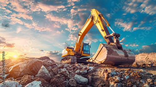 Excavator stands against a vivid sunset sky, highlighting construction and development