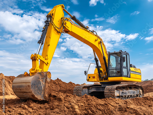 Excavator Working on Construction Site Under Blue Sky and Clouds in Daylight