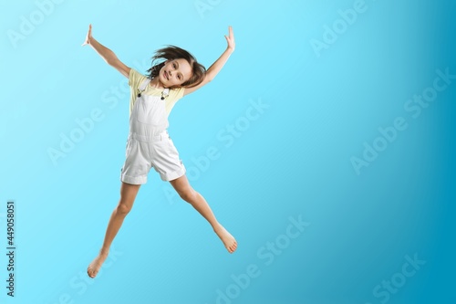 excited, active, activity, adorable, appearance, arms raised, blue background, girl, casual attire, charismatic, children, childhood, content, cool, curly hair, delight, dynamic, energy, expressive, fashion, freedom, full body, full-length, funny, coiffure, happy, having fun, individuality, innocent, joy, jump