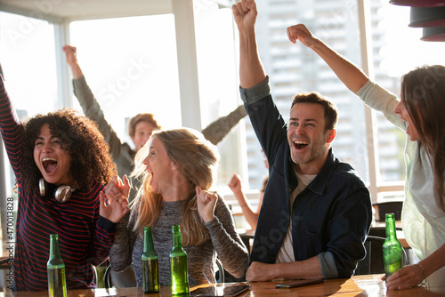 businesswoman, businessman, woman, young adult, mature adult, male, female, man, achievement, teamwork, celebration, excitement, refreshment, happiness, togetherness, friendship, photo, shirt, casual clothes, desk, day, indoor, office, sunlight, face to face, looking, gesticulate, toothy smile, hand raised, fist, long hair, front view, color image, horizontal, hand up, exciting, young adult, woman, man, female, male, office, horizontal, fist