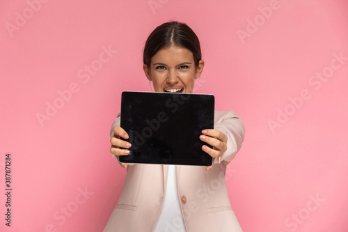 showing, presenting, blank, empty, screen, pad, tablet, computer, laptop, excited, enthusiastic, thrilled, woman, girl, businesswoman, female, model, people, business, fashion, suit, young, beautiful, beauty, cute, brunette, attractive, looking, wearing, holding, hand, smiling, happy, pink, studio, background
