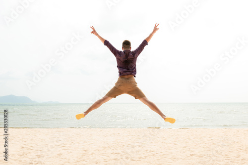 Excited energetic happy man jumping at the beach